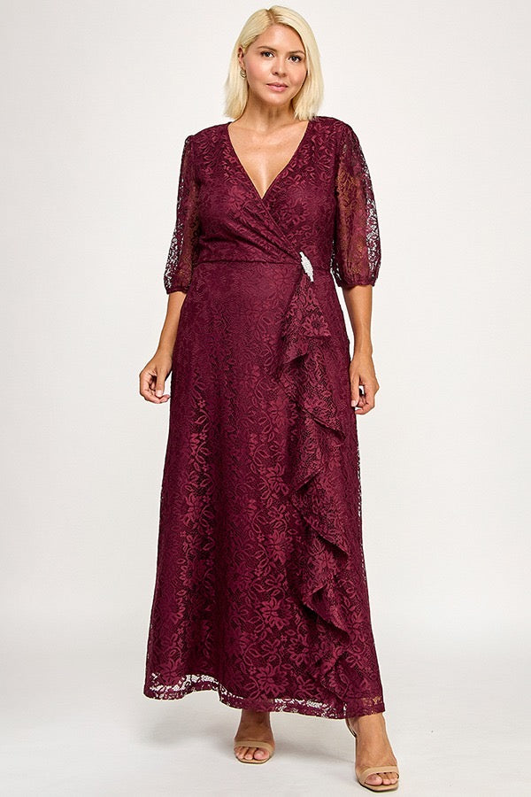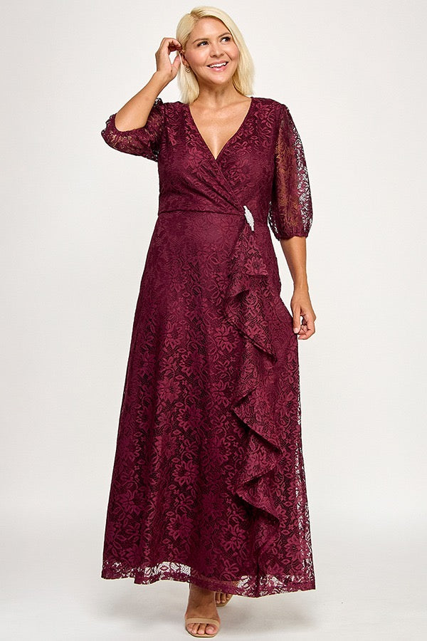 Vestido largo de encaje en color vino con escote en V y mangas tres cuartos semitransparentes. El cuerpo cruzado realza la silueta, mientras un volante vertical en la falda añade movimiento y sofisticación. El encaje floral aporta textura y elegancia clásica.